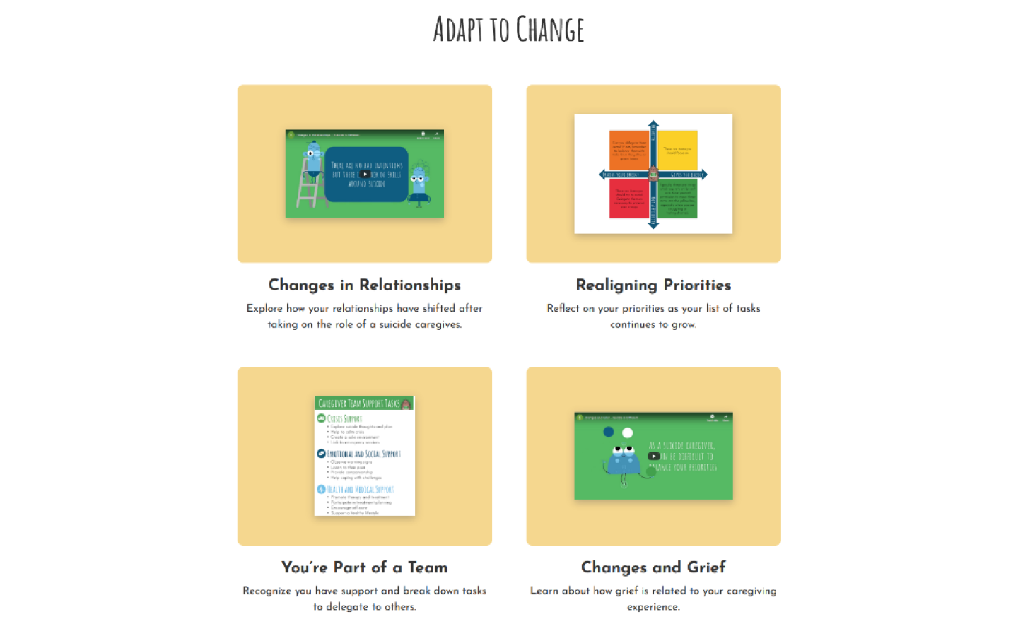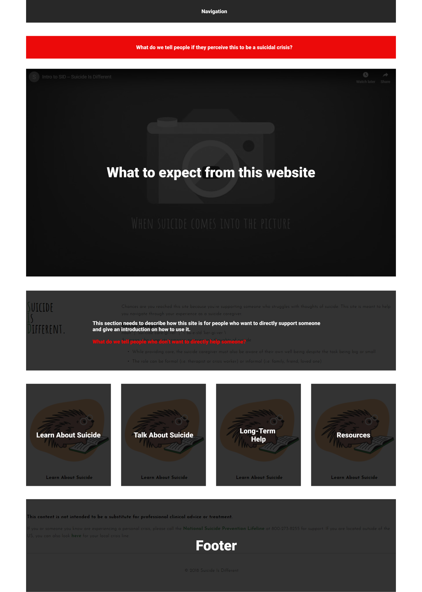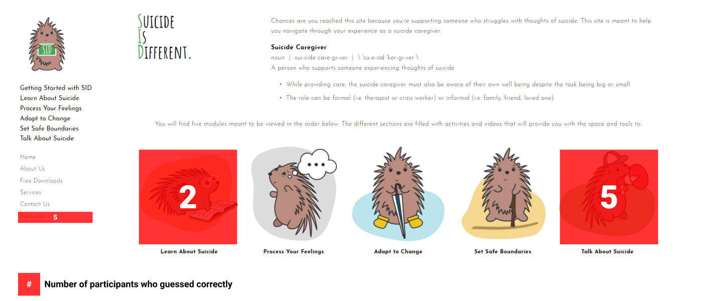 The original intent was to display suicide information in a 5 module sequence. Users would learn how to provide long-term support to people considering suicide.